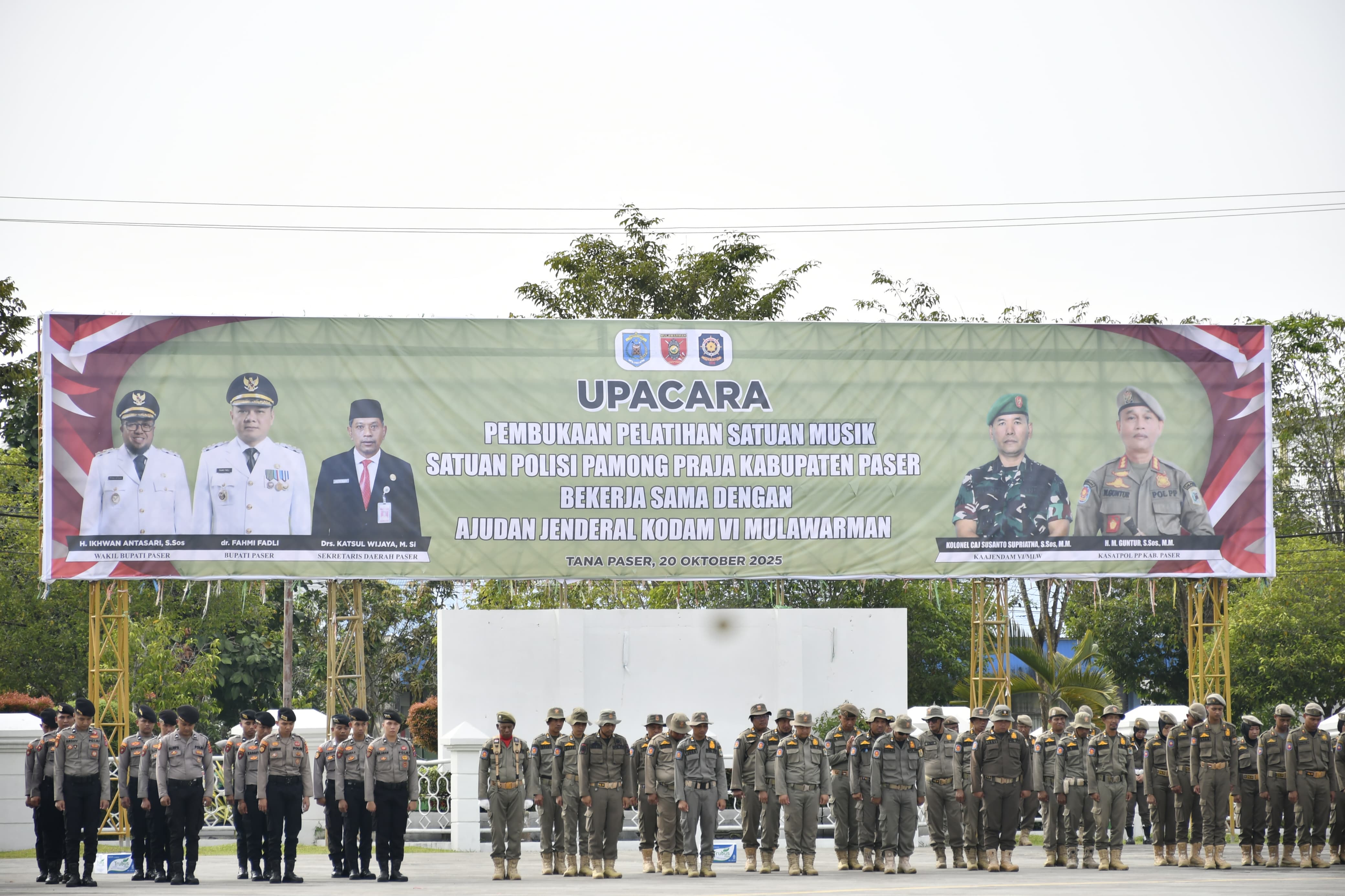 TANA PASER – Bupati Paser melalui Asisten Pemerintahan dan Kesejahteraan Rakyat Ir. H. Romif Erwinadi, M.Si menghadiri upacara pembukaan Pelatihan Satuan Musik Satuan Polisi Pamong Praja (Satpol PP) Kabupaten Paser yang bekerja sama dengan Ajudan Jenderal Kodam VI/Mulawarman. Kegiatan tersebut berlangsung di halaman Kantor Bupati Paser pada Senin (20/10/2025).